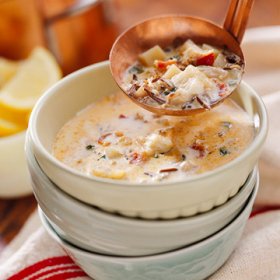 - Stir in whitefish, cooked wild rice and bacon. Return to boiling; reduce heat. Simmer, covered, for 2 to 3 minutes or until fish flakes easily when tested with a fork. Stir in whipping cream or half-and-half, fresh thyme, if using, basil, and parsley; heat through (do not boil). Season to taste with salt and pepper. Garnish each serving with some green onions and a lemon wedge. Makes 6 servings (about 5-1/2 cups).