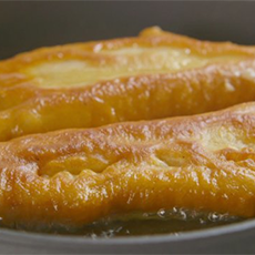 Now take one of the fillets and turn it over in the batter again and then holding it at either end, lay it flat in the hot oil, skin side up, then quickly do the same with the second fillet.